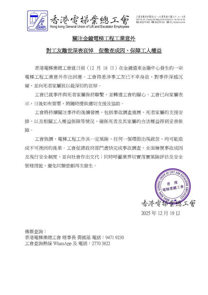 香港電梯業總工會就日前(12月18日)在金鐘遠東金融中心發生的一宗電梯工程工業意外作出回應。工會得悉涉事工友已不幸身故,對事件深感沉痛,並向死者家屬致以最深切的哀悼。