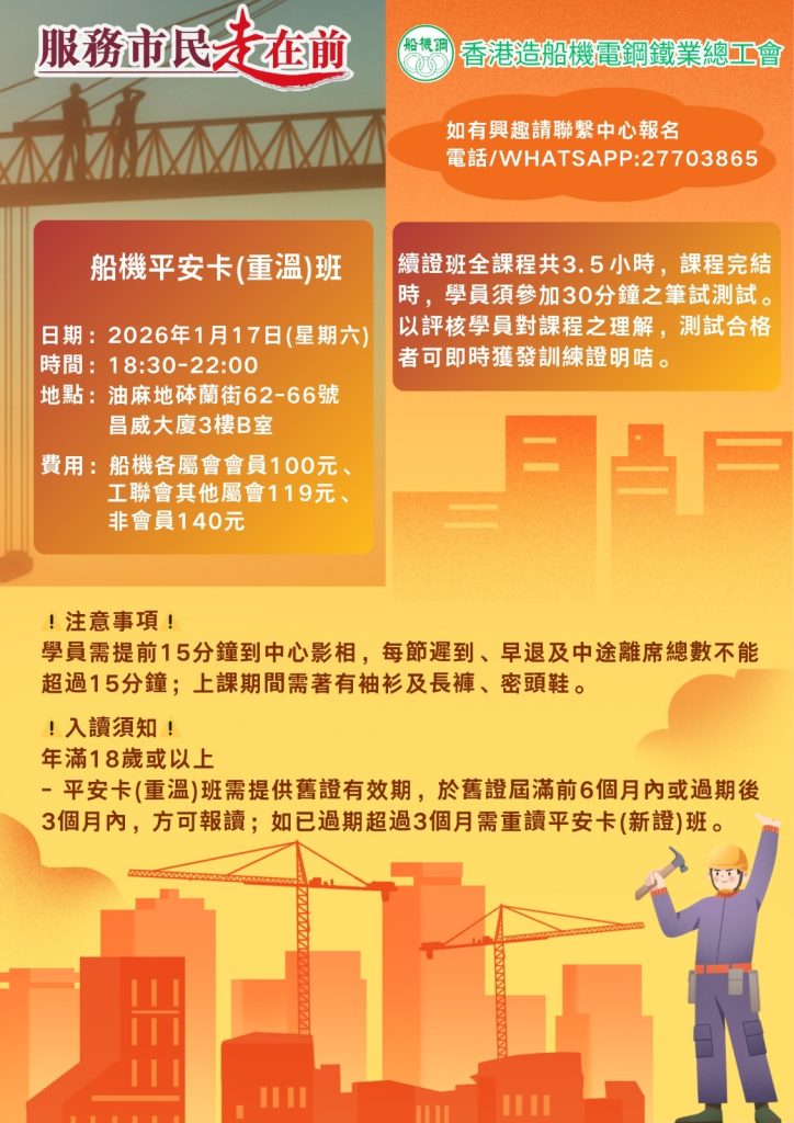 船機總會及屬會會員專享: 平安卡(續期)班日期:2026年1月17日(星期六)時間:6:30PM-10:00PM地點:油麻地砵蘭街62-66號昌威大廈 …